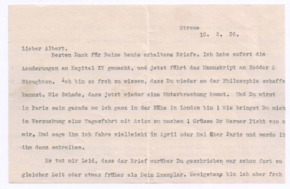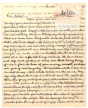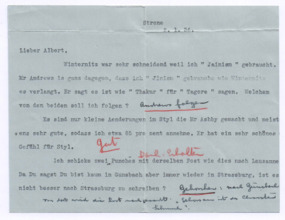 | 31 | | Brief von Lilian Russell an Albert SchweitzerFrage, ob sie der Meinung von Winternitz oder Mr. Andrews in einer Übersetzungsfrage folgen solle - Antwort: "Andrews folgen"; Mr. Ashby habe einen guten Stil, sie übernehme 85% von dessen Arbeit - Notiz: "gut"; sie sende zwei "Punches" nach Lausanne - Notiz: "Dank. Erhalten"; ob es nicht besser sei, nach Straßburg zu senden - "Gehorchen: Nach Gunsbach von dort wird die Post nachgesandt. "Gehorchen ist des Christen Schmuck""; von den indischen Denkern erhalte sie das ganze Exemplar mit Änderungen; sie nutze ein Medikament für die Zähne; Frage nach Helene; Bitte, er möge angeben, welche Briefe er erhalte und beantworte; ihr Gut in Kanada sei noch nicht verkauft. | Russell, Lilian: Hôpital du Dr. Albert Schweitzer Lambaréné [Strone, Großbritannien] | Schweitzer, Dr. Albert: Hôpital du Dr. Albert Schweitzer Lambaréné | 02.01.1936 | 2 | M001-A262-Z001-I001 | |