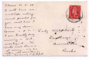 | 35 | | Postkarte von Lilian Russell an Lady Kirkpatrick[auf Englisch] Sie sei mit der Pflege eines kranken Affen okkupiert; Rhena komme laut dem Doktor nicht, nur Helene; Motiv Vorderseite : Patienten; Titel: "Lambarene"; Beschriftung: "Patients leaving the Hospital after operation". | Russell, Lilian [Strone, Großbritannien] | Kirkpatrick, Lady [Buckinghamshire, Großbritannien] | 10.05.1938 | 2 | M001-A262-Z001-N001 | |