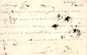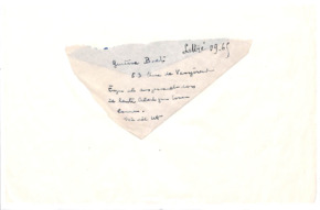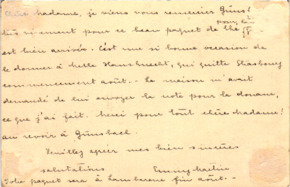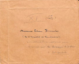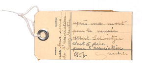 | 39 | | Paketanhänger Emmy MartinPaketanhänger, französisch beschriftet; Vorder- und Rückseite mit unterschiedlicher Handschrift und Datum; Vorderseite: "aux vous soirs de l'association - Emy Martin"; "Apré ma mort pour le musée Albeert Schweitzer - desk a dire pour l'association - 1957 Emy Martin"; Rückseite: "Letters from Dr. Schweitzer"; "donné ces lettres á Mme Emy MAertin - Albert Schweitzer 15.10.49". | Martin, Emmy | | - | 2 | M001-A262-Z001-Q004 | |