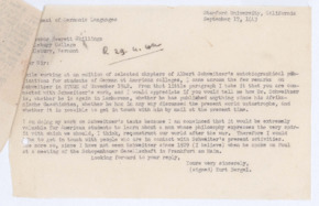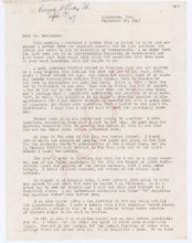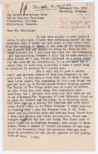| 222 | | Brief von Chester H. Stripe an Everett SkillingsEntschuldigt sich für die Umstände, die sich Skillings habe machen müssen, um Stripes Aufenthaltsort herauszukriegen; berichtet von seiner Fahrradsreise durch einige amerikanische Staaten, bei der er bereits über 2000 Meilen zurückgelegt habe, und seinem Vorhaben ihn in Middlebury zu besuchen, doch zu diesem Zeitpunkt sei Skillings in Maine gewesen; erkundigt sich, ob Schweitzer nach Amerika kommen werde, denn er wolle ihm Fragen zu Bach stellen; er habe es gehasst, Nürnberg verlassen und in die USA zurückkehren zu müssen | Stripe, Chester H. [Milwaukee, Vereinigte Staaten von Amerika] | Skillings, Everett: The Albert Schweitzer Fellowship [Middlebury, Vereinigte Staaten von Amerika] | 17.09.1947 | 2 | M001-A945-Z001-I002 |