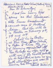 | 215 | | Brief von Everett Skillings an Albert SchweitzerVon Emory Ross habe er erfahren, dass Emma Haussknecht nicht nach Portland kommen, sondern in Boston sein werde, er werde dorthin reisen, um sie hoffentlich kennenzulernen | Skillings, Everett [Portland, Vereinigte Staaten von Amerika] | Schweitzer, Albert: Hôpital du Dr. Albert Schweitzer Lambaréné [Lambarene, Gabun] | 24.12.1953 | 1 | M001-A945-Z001-G003 |