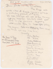 | 219 | | Brief der Schüler von Mrs. James F. Riggers an Albert & Helene SchweitzerDie Klasse schenkt ihm 15 Dollar zum Geburtstag und hofft, dass er das Geld für sein Krankehaus verwenden werde; im Unterricht sprächen sie oft über seine Arbeit; sie würden ihn gern Orgel spielen hören; im Unterricht hätten sie über Moses gesprochen und seien der Meinung, Schweitzer sei wie er; unterzeichnet von 13 Schülern | Riggs, Mrs. James F.: Riverside Church [New York, Vereinigte Staaten von Amerika] | Schweitzer, Albert & Helene | 25.02.1945 | 1 | M001-A945-Z001-H002 |