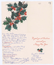 | 224 | | Grußkarte von Everett & Mildred Skillings an Emmy MartinWeihnachtsgrüße | Skillings, Everett & Mildred [Portland, Vereinigte Staaten von Amerika] | Martin, Emmy | 24.12.1952 | 1 | M001-A945-Z001-I004 |