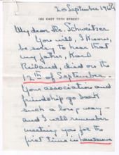 | 1 | Brief von Virginia Reiland Watson an Albert Schweitzer; mit AnhangSie teilt Schweitzer den Tod ihres Vaters Karl Reiland mit; sie betont die große Wertschätzung und Bewunderung, die Reiland Schweitzer entgegen gebracht habe; abschließend übermittelt sie Grüße und verzichtet ausdrücklich auf eine Antwort; beiliegend ein handschriftlicher Text von Emmy Martin über Reiland | Reiland Watson, Virginia [New York, Vereinigte Staaten von Amerika] | Schweitzer, Albert [Lambaréné, Gabun] | 20.09.1964 | 6 | M001-A161-Z001-E001 |