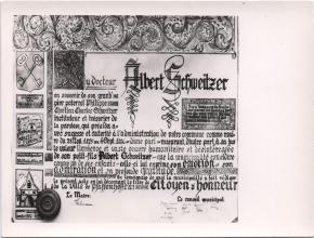 | 79 | | Auszeichnung Albert Schweitzers zum Ehrenbürger der Stadt Pfaffenhofen"Citoyen d'honneur de Pfaffenhoffen." | [Pfaffenhofen, Frankreich] | Silbergelatineabzug | 12.11.1954 | 1 | M001-P003-Z001-G924 |