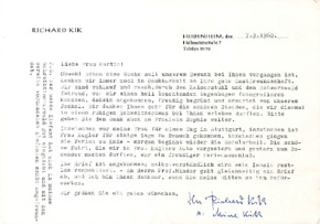| 231 | Brief v. Richard Kik an E. Martin | Kik, Richard [Heidenheim, Deutschland]  | Martin, Emmy [Gunsbach, Frankreich]  | 07.09.1960 | 1 | M020-A279-D001-B001 | |